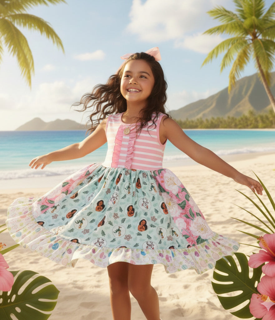 Our Moana Adventure dress is fashioned in our knit tank or flutter style bodice & a cotton ruffle skirting, perfect for wowing the crowd! Hand designed from a delightful mix of prints that please & colors that pop. Great for Magical vacations, Disney days, gift giving, theme parties, & everyday wear!
