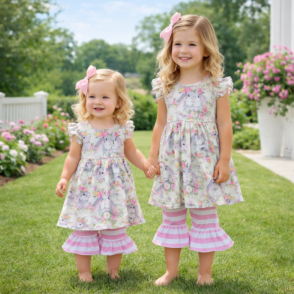 She’ll be a Girly sensation & the cutest Bunny in the bunch. This versatile Spring/Summer garden dress is a sweet piece for portraits, festivals, picnics, & pageants. The dress is made from an ultra comfy milk silk material & can easily be layered with a colorful cardigan or zip up. We are offering this as a very limited edition piece. Great for gift giving!